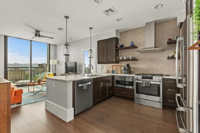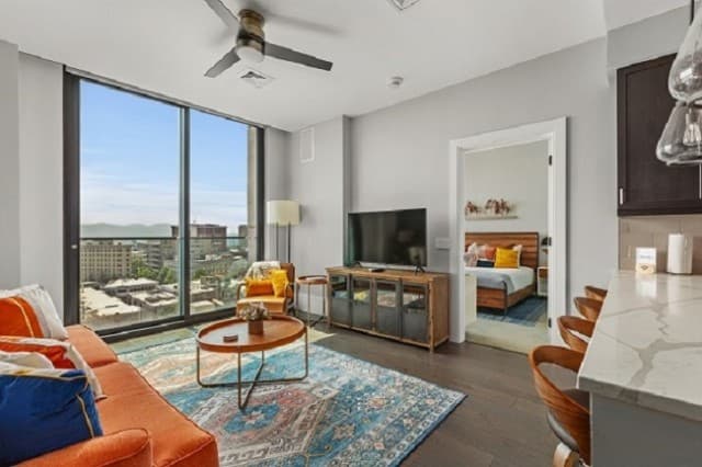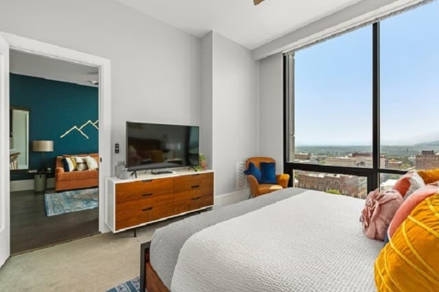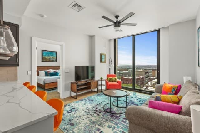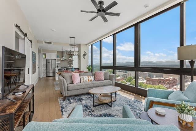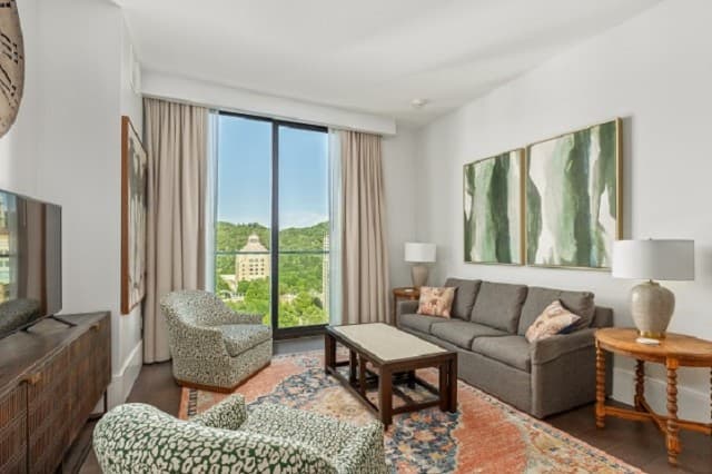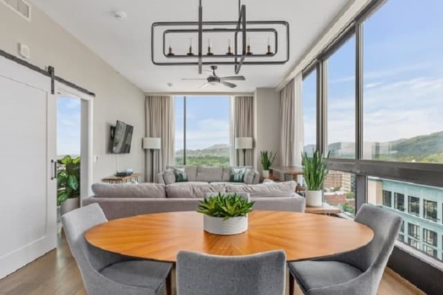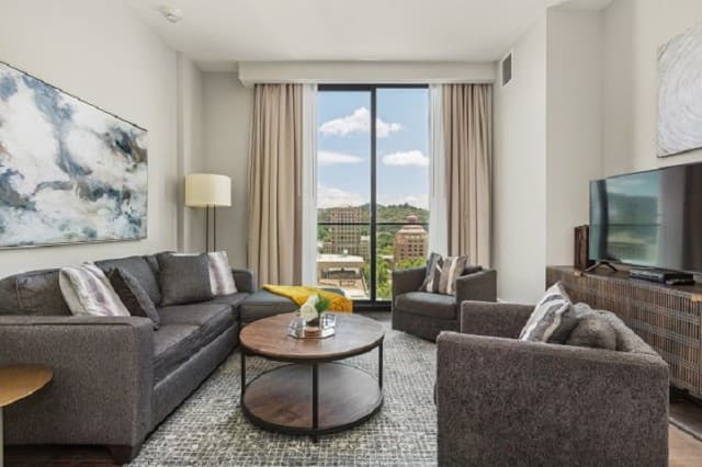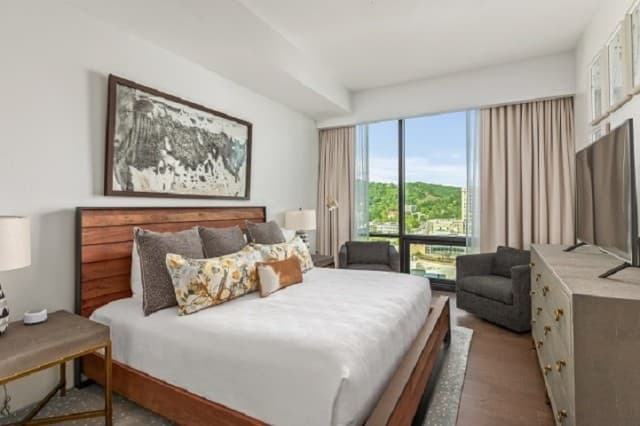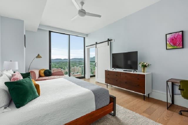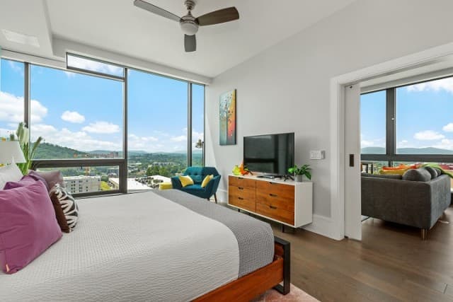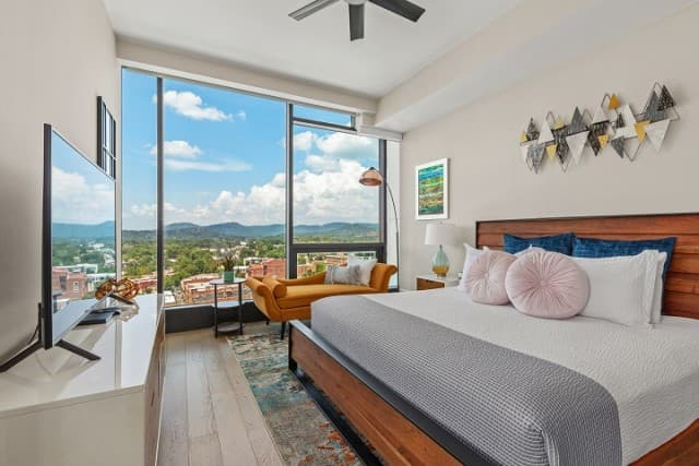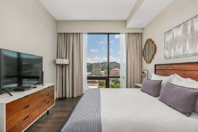 Whether you’re staying a week or an entire season, Arras Vacation Rentals places you in the heart of downtown Asheville. Enjoy a comfortable, modern mountain retreat with everything you need to feel at home, including a gourmet fully equipped kitchen with plenty of cooking essentials and a comfortable king-sized bed. Our open-concept condos offer stunning panoramic mountain and city views with floor-to-ceiling windows, ideal for unwinding after a day of hiking, meetings, or downtown exploring. Wi-Fi, Fully Equipped Kitchen, A/C, Washer/Dryer, Coffee Maker, Cooking Essentials, 10 condos with 1 bedroom and 1 bath, including select pet-friendly units, onsite restaurants and bar, access to fitness center and valet parking.