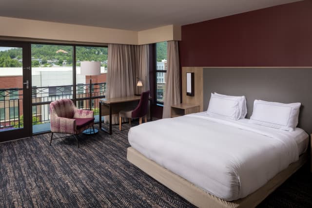 Close to the Asheville Regional Airport, near I-26, is the Hilton Asheville Biltmore Park, an environmentally friendly, LEED Silver-certified hotel. Minutes from the Biltmore Estate and Historic Biltmore Village, the Hilton Asheville Biltmore Park is located in the heart of Biltmore Park Town Square, where dining, shopping, and entertainment are just steps from the hotel’s door. This modern 165-room Hilton features spacious executive suites, an indoor pool, EV charging stations, free parking, on-property signature restaurant Fork Lore, a state-of-the-art fitness center, and Sensibilities Spa, a full-service destination spa. Beyond the hotel's focus on comfort is its emphasis on sustainability. The Hilton Asheville Biltmore Park is one of the first in the nation to utilize a large-scale solar water heating system. The hot-water system, which will eliminate sixty tons of carbon dioxide yearly, is one of the many green measures the hotel is taking to promote a healthy environment, reduce energy costs, and gain Leadership in Energy and Environmental Design certification. This hotel property has pet friendly rooms so you can bring your furry friend along.