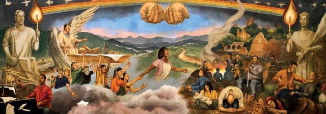 The Haywood Street Fresco in downtown Asheville, NC is based on the Beatitudes and features people who are a part of of Haywood Street Congregation's community. The principal artist, Christopher Holt, worked with a team of four other artists to complete the fresco in September 2019. The fresco is open for viewing by appointment. Contact Fresco Host April Nance at [email protected]. Visit haywoodstreet.org for more information.
