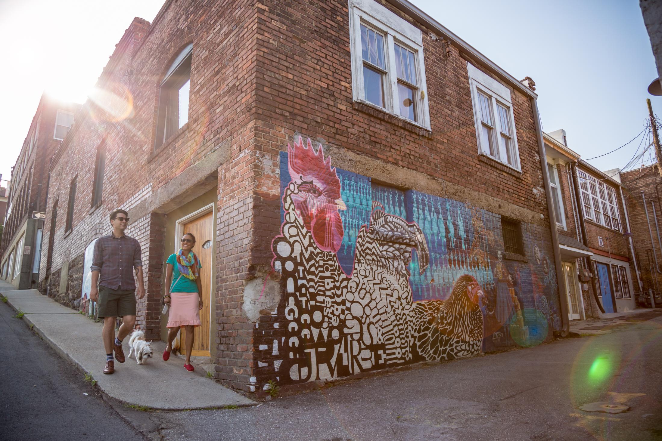 This area is also home to art you can’t help but happen across. Of course, it has that Asheville twist. A giant sculpture of an iron at the intersection of Battery Park and Wall Street and the not-so-garden-variety mural of attitude-laden chickens in Chicken Alley off of Woodfin Avenue enliven the downtown streets.