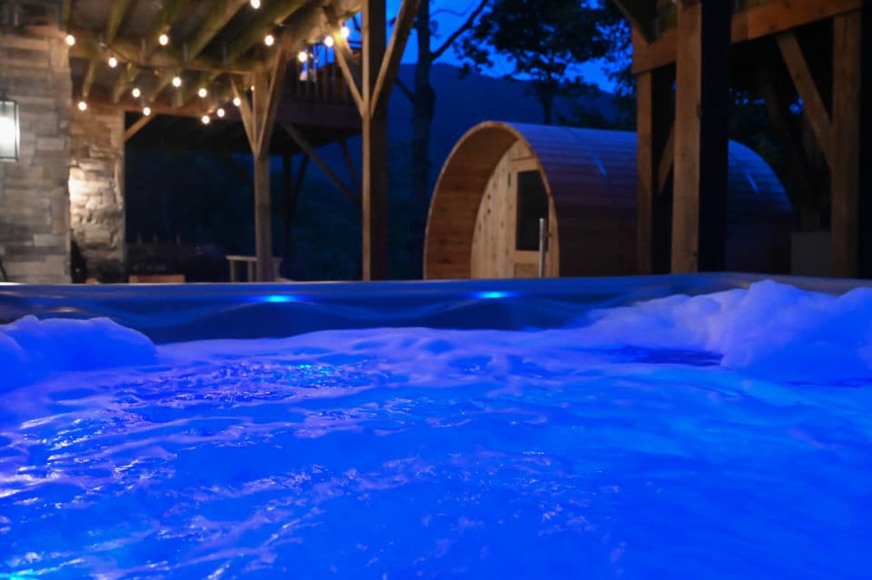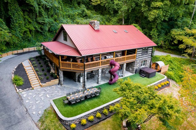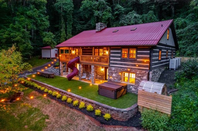 - Beaver Cabin – A cozy, rustic retreat with a firepit, game room, steam room, indoor slide, hot tub & sauna. Perfect for a peaceful escape with the family or friends.
