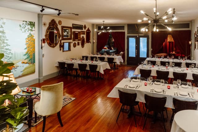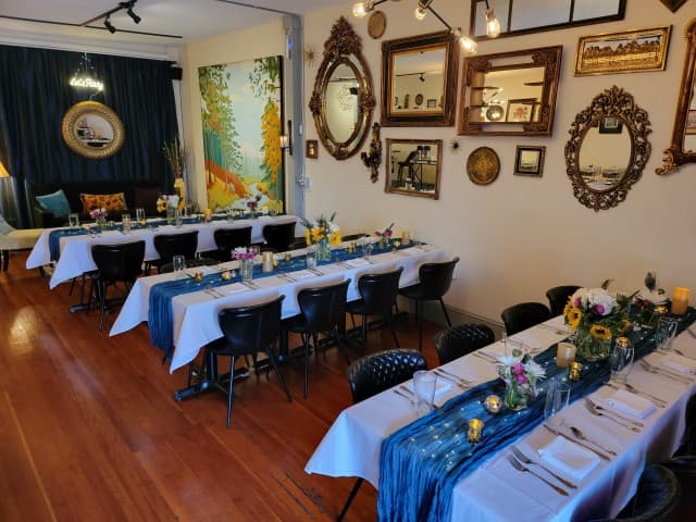 The Argot Room is Jargon's private event space directly next door to our restaurant in West Asheville.We are able to accommodate parties up to 40 people, and work closely with our clients to design an event and menu that is uniquely memorable. The Argot Room is the perfect space for get-togethers of all kinds: Brunches, luncheons, bachelorette/bachelor party dinners, rehearsal dinners, graduation or birthday celebrations, baby showers, business dinners, and even band performances! The Argot Room has its own catering kitchen, space for a dance floor to get that party started, and even audio/visual capabilities for special presentations.