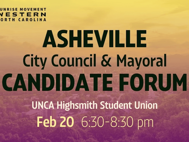 Sunrise Movement WNC and Sunrise Movement UNCA invite Buncombe county residents to get better acquainted with the Asheville City Council and Asheville Mayoral candidates at a forum on Friday, February 20th from 6:30-8:30 at Highsmith Student Union at the University of North Carolina Asheville campus. Please join us for an opportunity to hear about how candidates plan to fight climate change and make Asheville work for working people. Attendees will have ample opportunity to ask candidates their own questions in small group discussions.