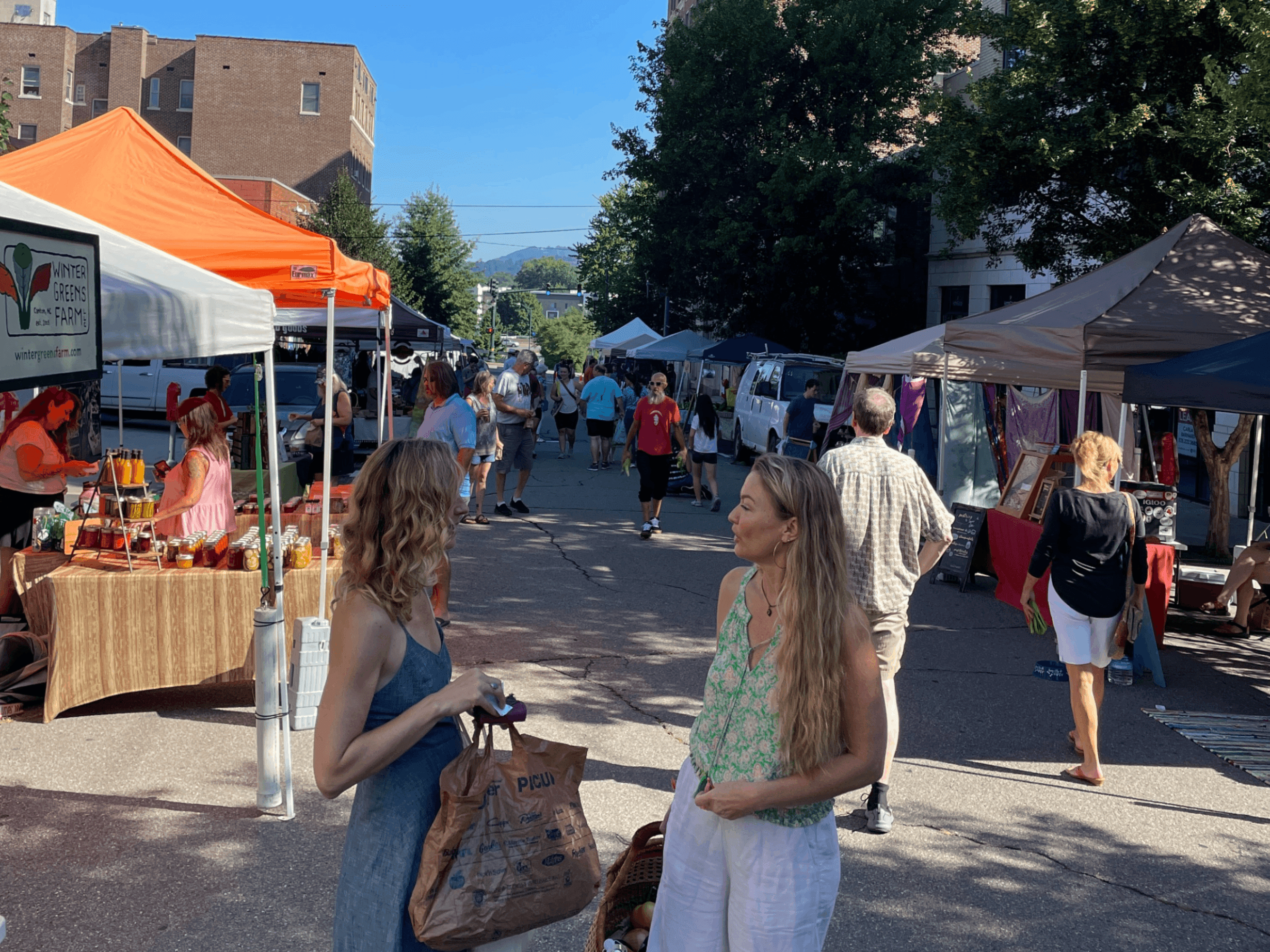 We are a year-round, producer-only farmers market located in downtown Asheville, supporting local farmers and vendors alike. Each week, the market hosts 35–45 vendors offering a wide variety of fresh local produce, meats, eggs, honey, baked goods, herbal medicines, soaps, and more! The market also features local artists performing live music, with chairs and tables available for customers to relax and enjoy.