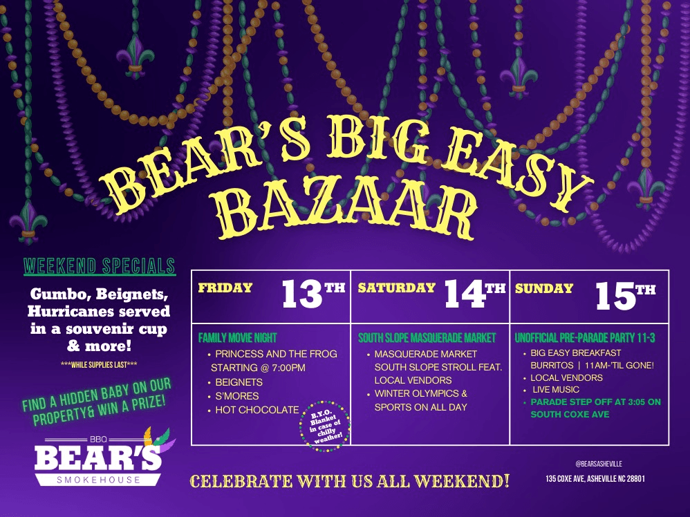 Let the good times roll at Bear’s Smokehouse BBQ with a full weekend of Mardi Gras fun! Enjoy a family-friendly movie night, Masquerade Market with local vendors, festive cocktails, live music, beignets, gumbo, and the ultimate pre-parade party before the Mardi Gras parade kicks off on Sunday!