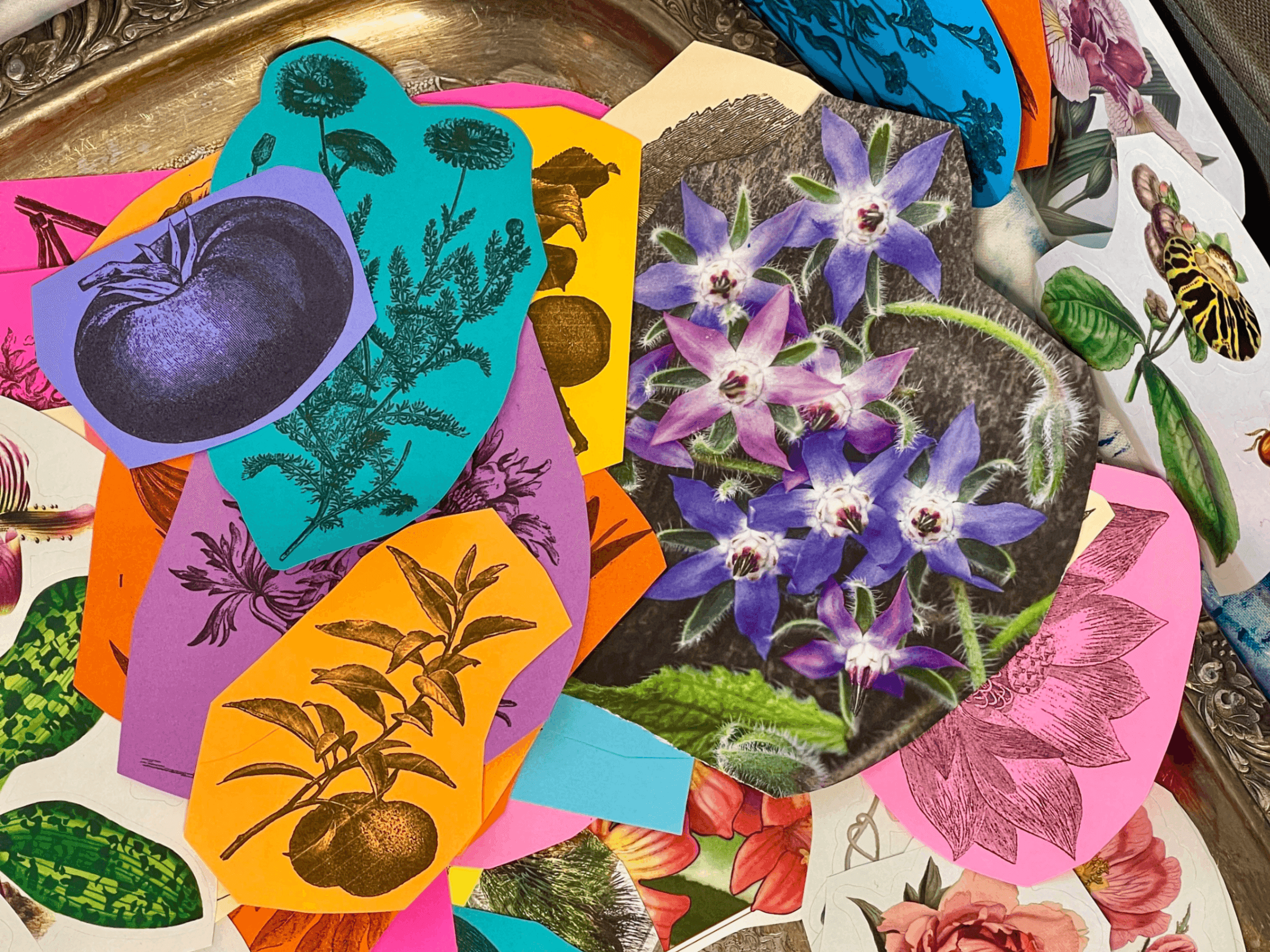 - A treasure trove of botanical collage materials: vintage ephemera, vibrant painted papers, and a special collection of recycled papers. Think florals, trees, fruits and vegetables, herbs! An oasis of collage wonders!