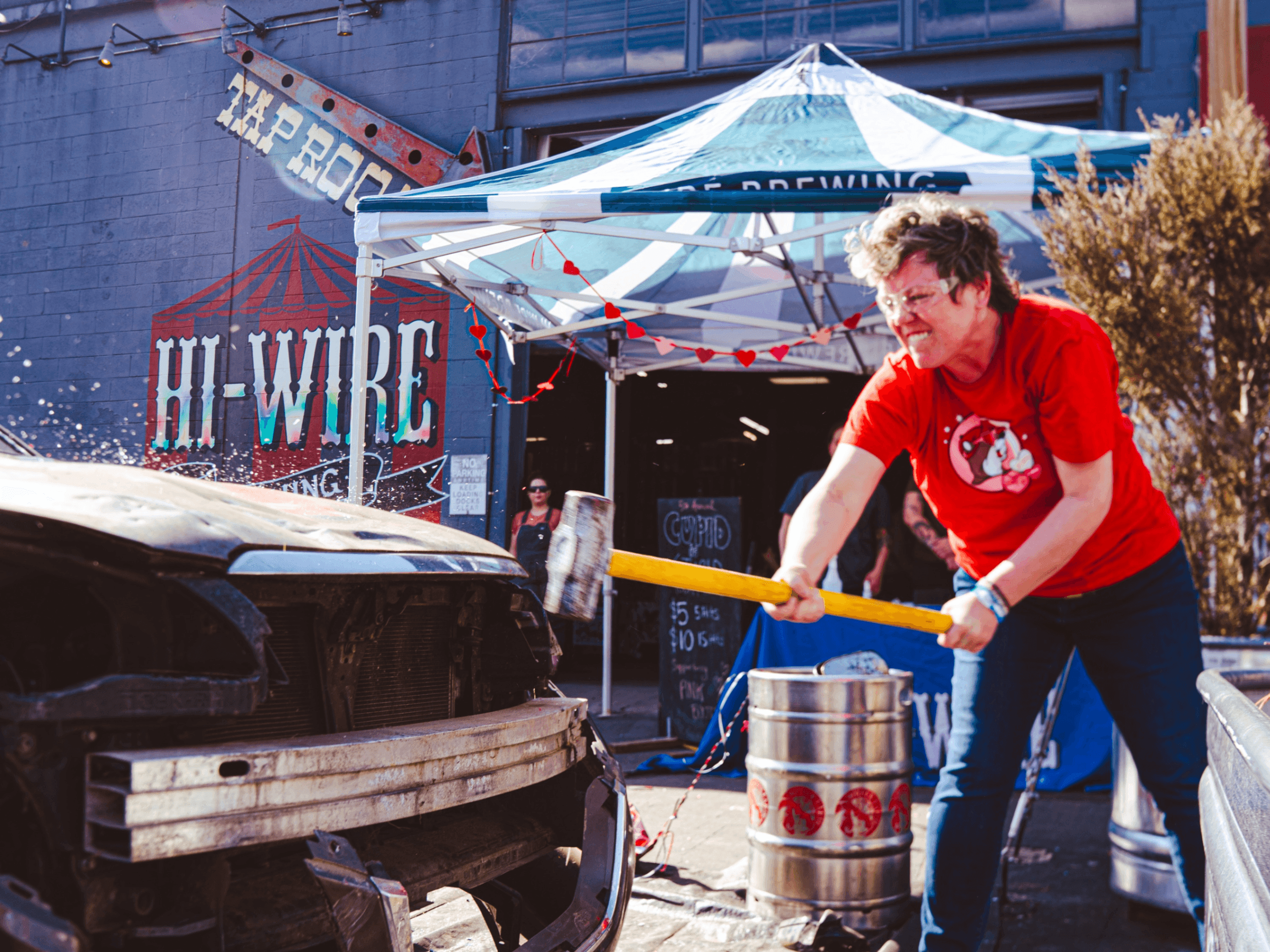 A car generously provided by Biltmore Iron and Metal Co Inc. will be sacrificed for the cause, and all proceeds benefit the Pink Boots Society of North Carolina, an organization dedicated to assisting, inspiring, and encouraging women in the beer industry through education and career advancement.