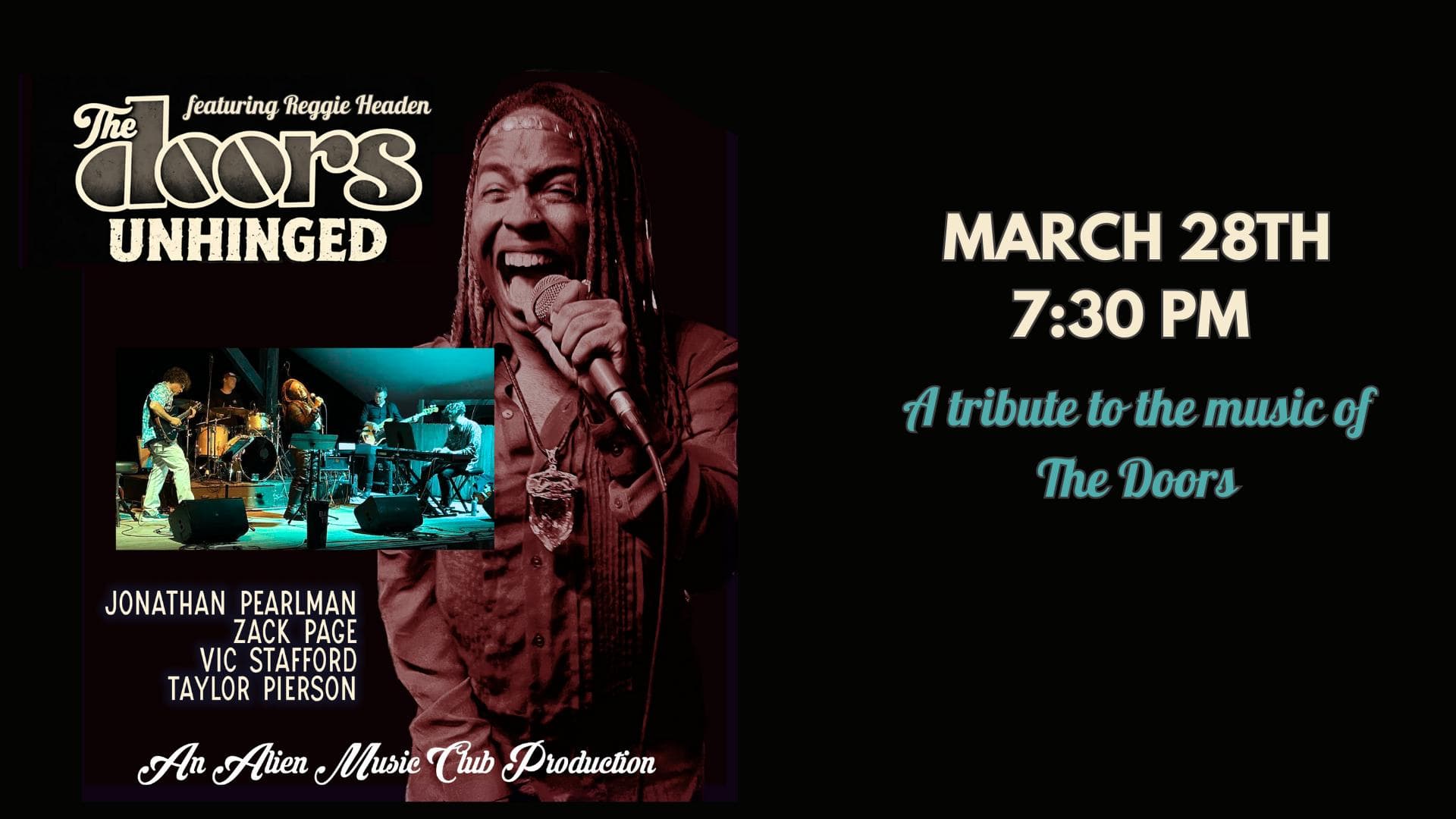 - With an intoxicating, genre-blending sound, provocative and uncompromising songs, and the mesmerizing power of singer Jim Morrison’s poetry and presence, The Doors had a transformative impact not only on popular music but on popular culture. This Asheville-based quintet, fronted by the charismatic and electrifying Reggie Headen, features an all-star, highly sought after group of musicians: Jonathan Pearlman (Musical Director and guitarist), Taylor Pierson (keyboards), Zack Page (bass) and Jay Hoots (drums). Pearlman says, “There’s something very daring, dangerous and dark about the Doors’ music. We’ve tried to capture that. We found it challenging to approximate their chemistry and alchemy. I believe that we got it right!”