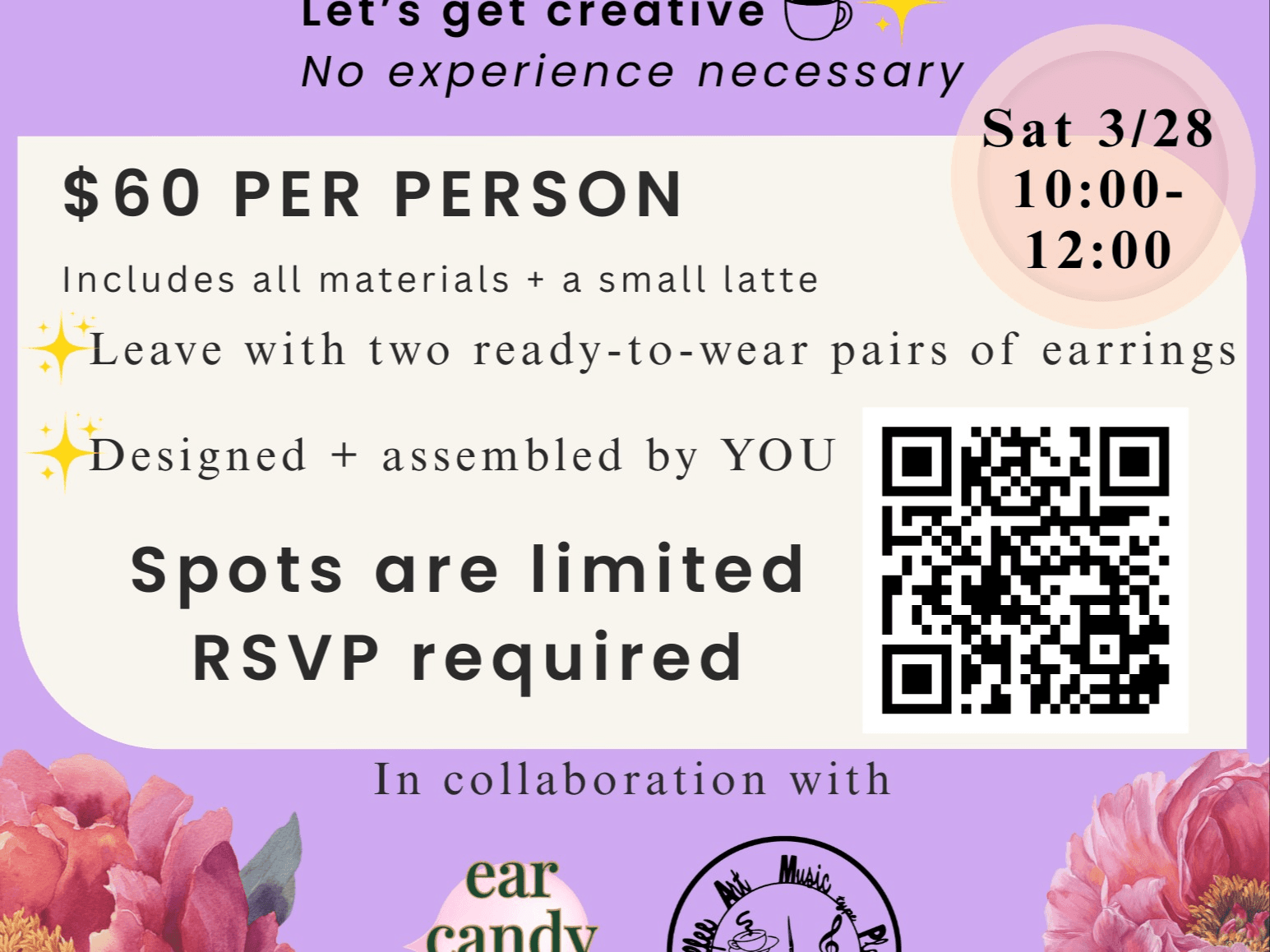 Your ticket includes all materials, step-by-step instruction, and a small latte to enjoy while you work. The workshop runs from 10:00–12:00 on Saturday, March 28, and space is limited, so advance RSVP is required. Everything you need will be provided—just show up, relax, and leave with earrings you’ll be proud to wear (or gift).
