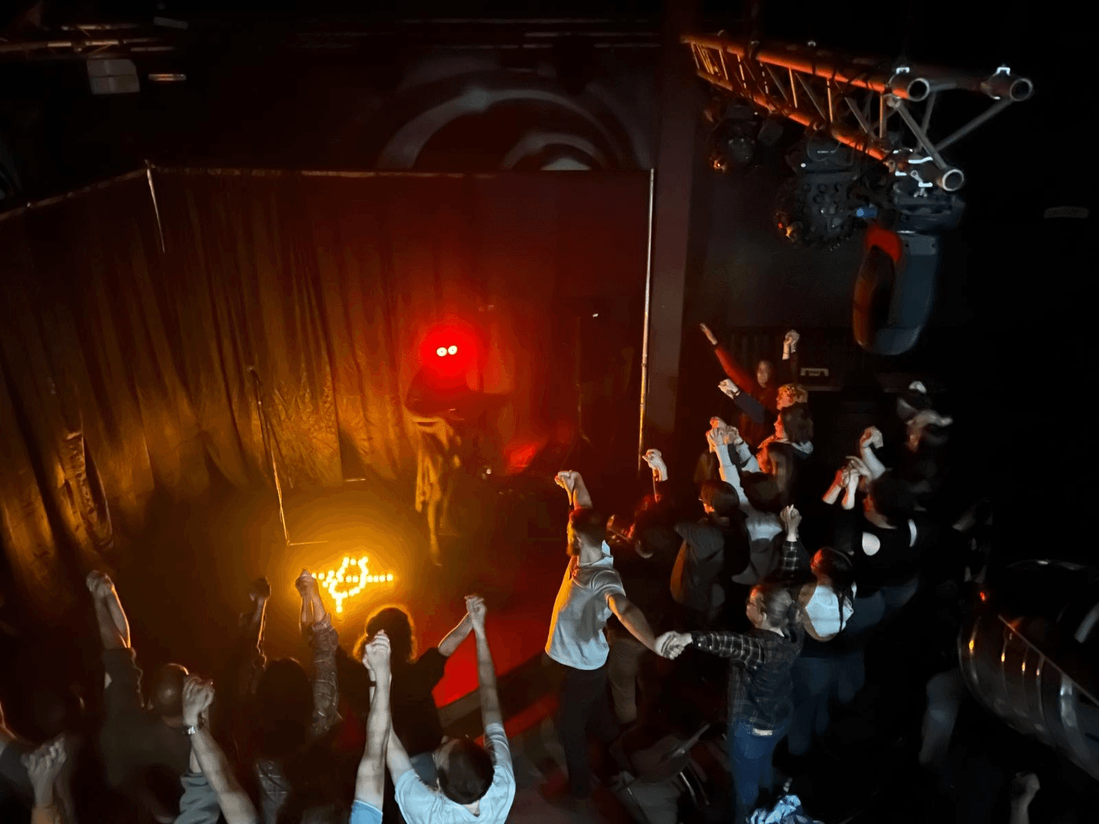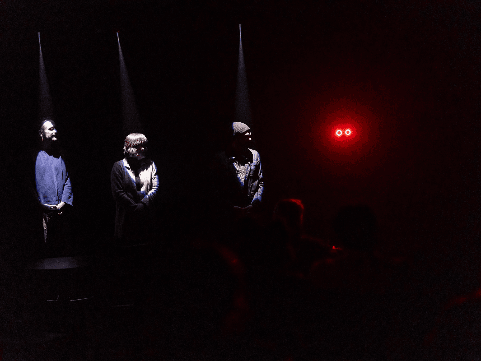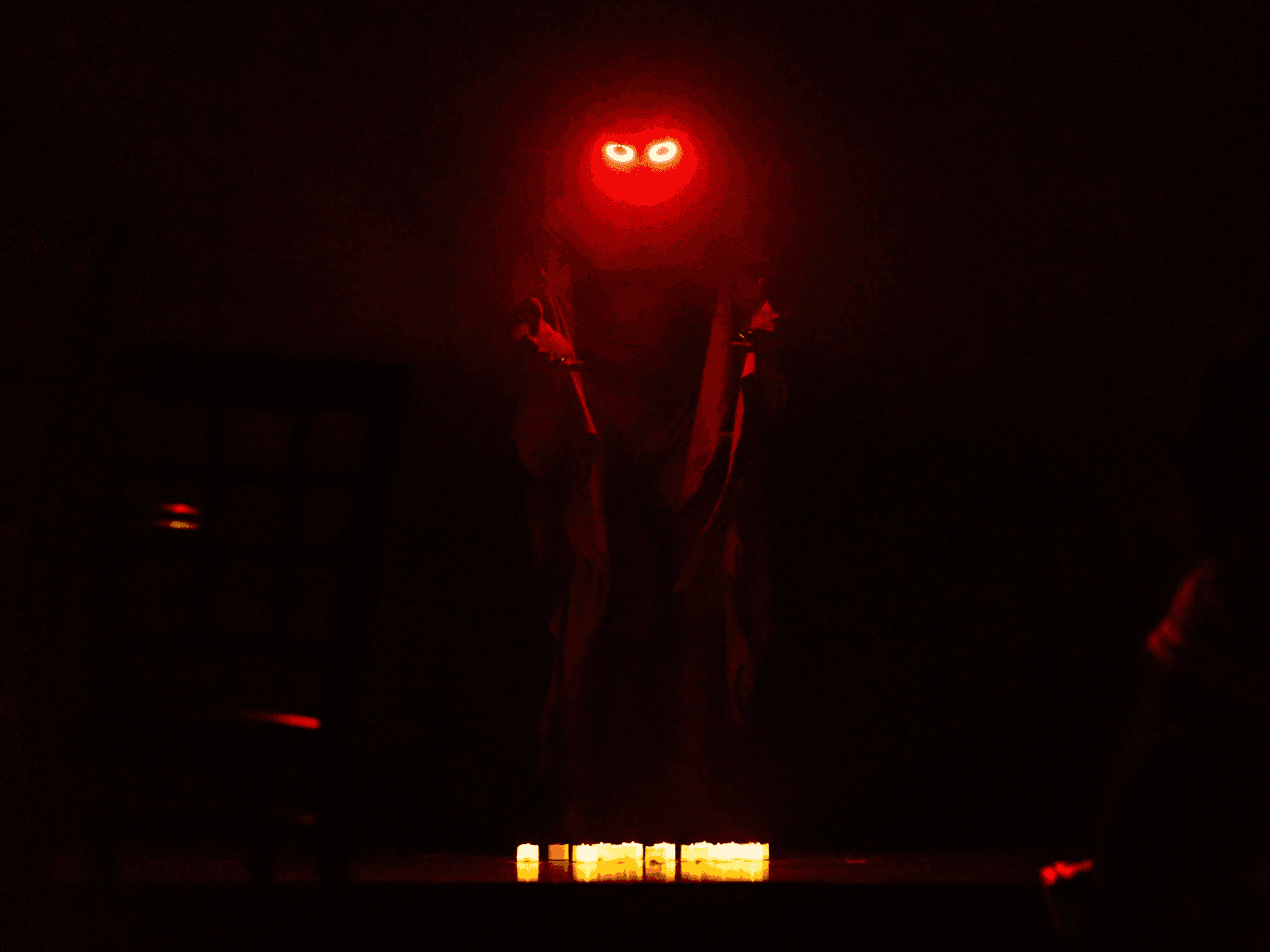 This show is performed mostly in the dark, lit by Mothman's glowing red eyes.