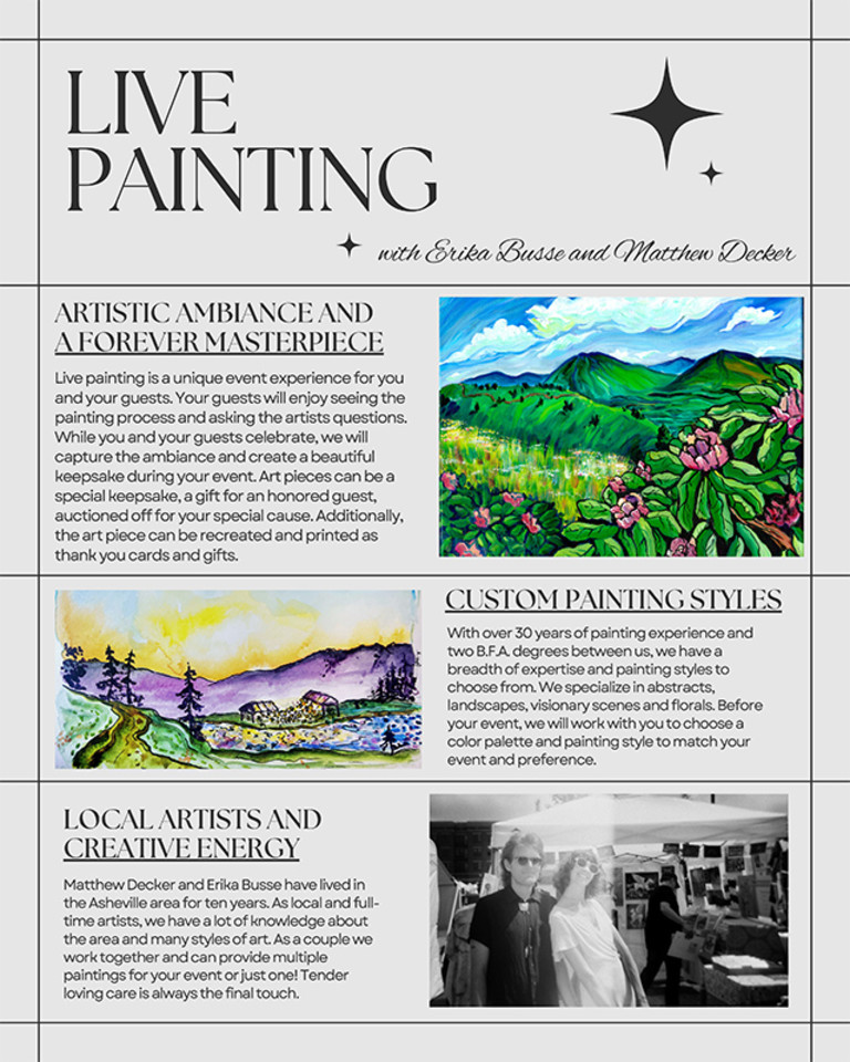 - Local artists, Matthew Decker and Erika Busse, invite you to partake in an exclusive painting class designed for you and your gathering. Envision a splendid day amidst the crisp mountain air, enveloped by the breathtaking beauty of the Blue Ridge Mountains. Your group will rendezvous with Matthew and Erika at a chosen overlook along the Blue Ridge Parkway, where all will be ready upon your arrival. They will guide you through each brushstroke, revealing the enchanting world of acrylics as you capture the scenery before you. Each participant will create their own unique masterpiece. Alongside the essential supplies and expert guidance, your ticket also encompasses delectable snacks tailored to your dietary needs. Kindly message me using the form below, detailing your party size and preferred date range for this artistic adventure. This class is perfect for bridal parties, double dates, and anniversaries, ensuring an unforgettable experience and a cherished keepsake to bring home.