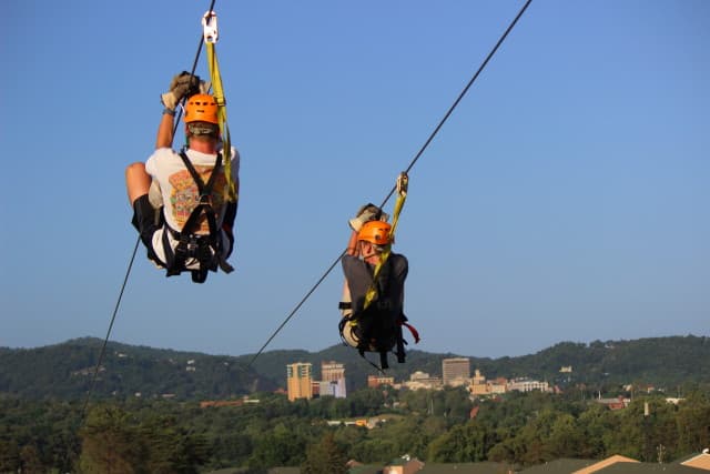 Asheville Zipline Canopy Tours For ages 8 and over, we offer our Asheville Zipline Tour which is an urban zipline tour with 9 ziplines and 1 sky bridge to go zipping through the trees with views of downtown Asheville. Or, if you want the thrill with a shorter trip time, our Skyline Tour with 5 ziplines is perfect. Both trips include zipping side by side with a friend down 1,200-foot lines.Â
