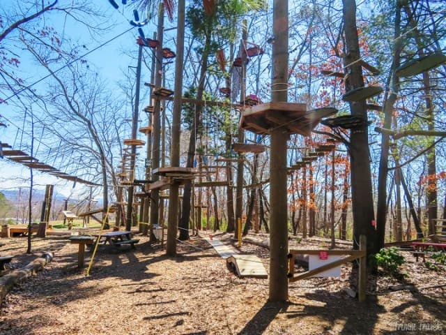 Asheville Treetops Adventure Park For ages 4 and over, we have 7 aerial trails with 77 elements from ground level to 50 feet in the air. For those old enough, choose which trails you want to conquer and have fun challenging your friends or family on our sky-kayak or hang glider, cheese wall or slide to nowhere, sea-turtle swing, or AERIAL snowboard.