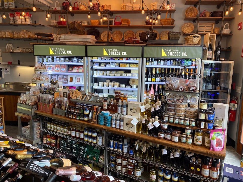- South Slope Cheese Co. caters to foodies looking for something beyond grocery store cheese. Visitors to the store will find over 100 varieties of cheese on display, of which many can be sampled prior to purchase. The shop offers pre- made and customized charcuterie boxes and everything needed to build your own charcuterie board. You will find specialty items such as caviar, champagne and a wide selection of wines. Gift cards, baskets and a variety of cheese- and wine-related gifts are also available. Open Monday-Saturday 10am-6pm