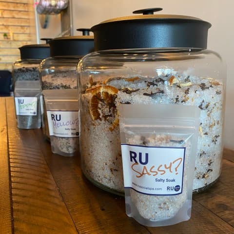 Recline & Unwind showcases a retail boutique with a variety of beverage options, and spa-related items including house made Salty Soaks in their Signature scents of RU Mellow?, RU Sassy? and RU Peppy?