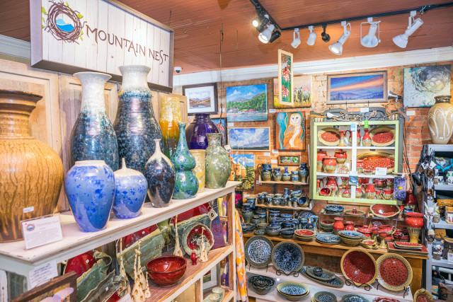 Come to Mountain Nest and find: original oil, acrylic, and watercolor paintings; fine art prints on both paper and canvas; handmade jewelry in silver, gold, and other fine metals; blown glass vessels and jewelry; beautiful and functional handmade pottery; and even more work in other mediums such as handmade wooden bowls, bark baskets, corn shuck dolls, natural fiber scarves, and steel metal sculptures.