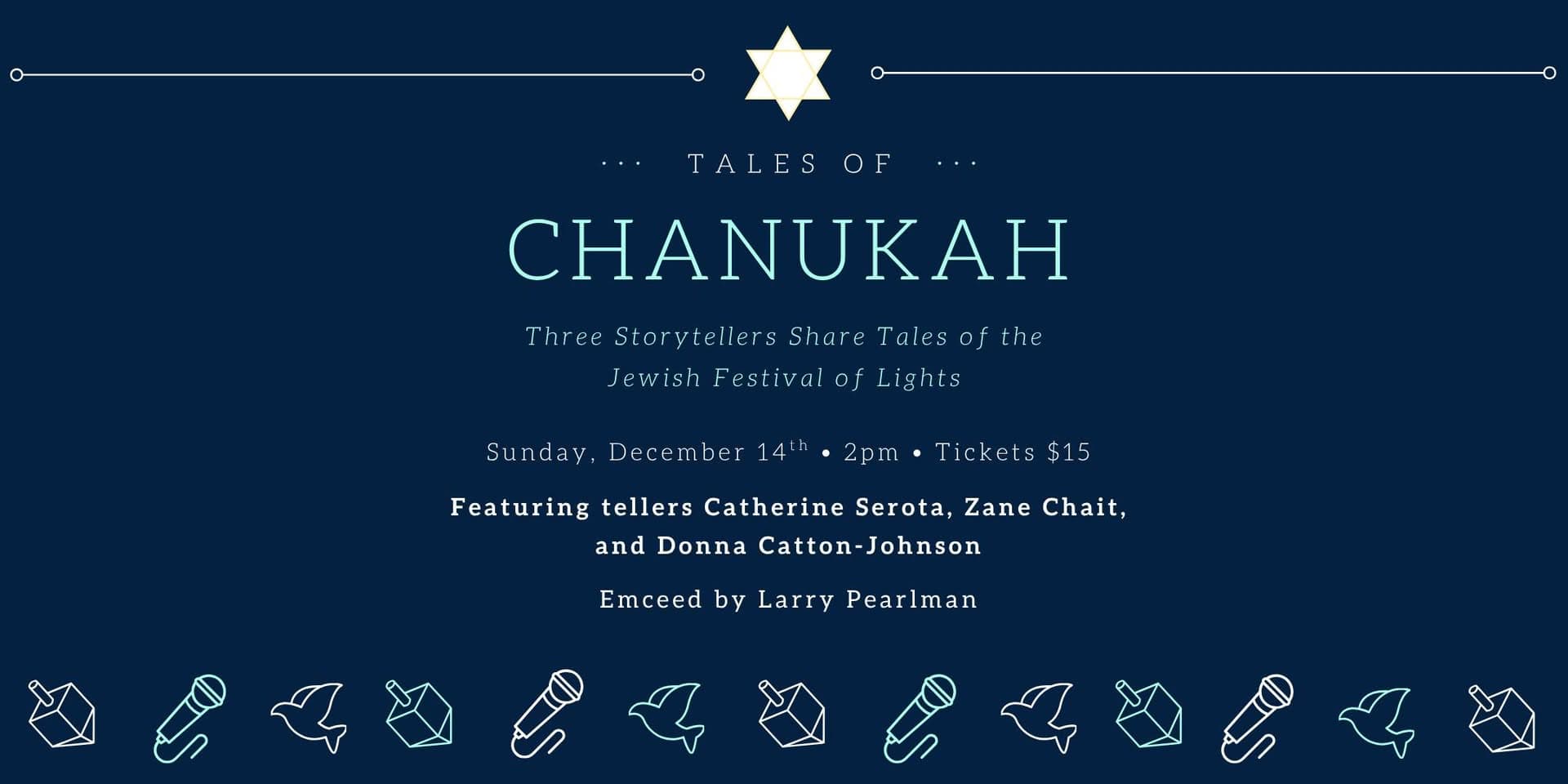 - Join us as three storytellers share tales of Chanukah - the Festival of Lights. These varied stories will warm your hearts and uplift your spirits regardless of your religious background. Tales of Chanukah will celebrate this season of love and light. Featured tellers are Catherine Serota, Zane Chait, and Donna Catton-Johnson. Larry Pearlman will emcee the event.