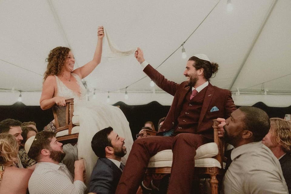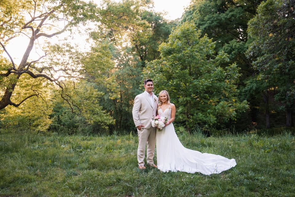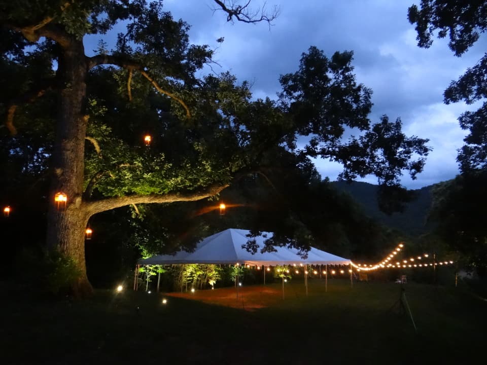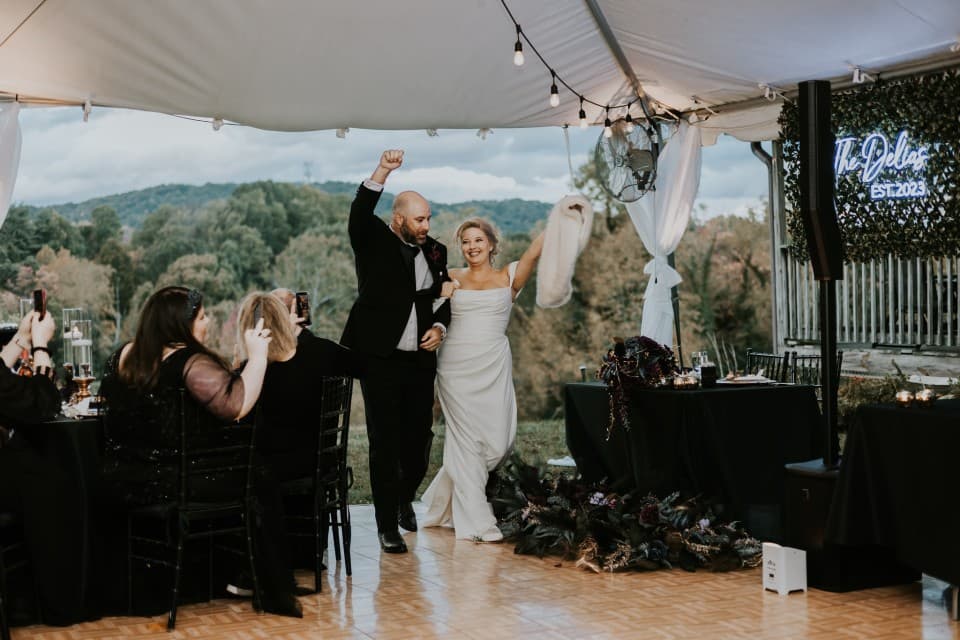 The Honey Hill ceremony site, set in a sprawling meadow with a pavilion and surrounded by trees, offers stunning mountain vistas. For receptions, the Vineyard Overlook boasts a frame tent with parquet flooring, charming string lights, and rustic chandeliers.