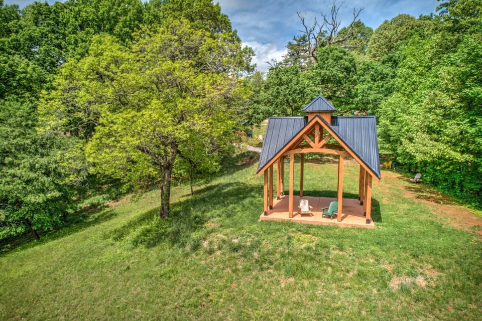 Engadine Inn and Cabins, spanning 12 acres at the base of the Blue Ridge Mountains, showcases a Historic Victorian Chateau, six spacious cabins, and two picturesque outdoor venues perfect for weddings and elopements near Asheville.