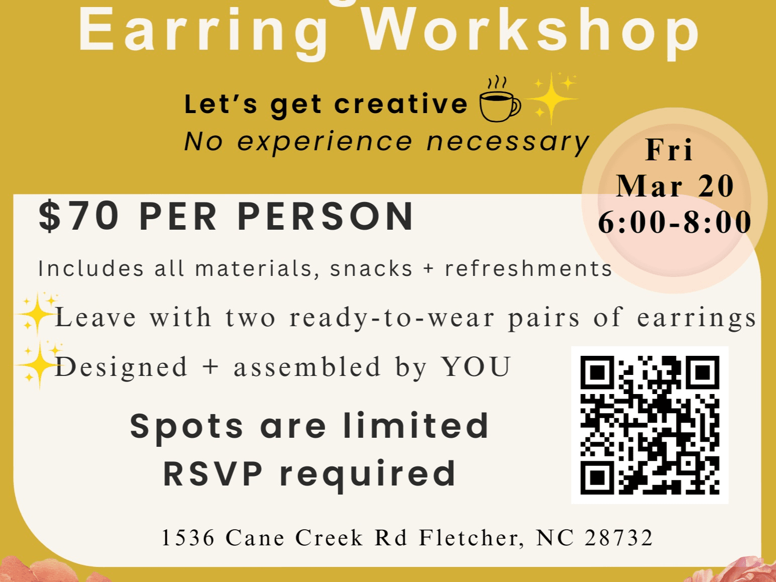 Your ticket includes all materials, snacks, and refreshments, and you’ll leave with two ready-to-wear pairs of earrings designed entirely by you. This workshop is perfect for a fun night out, a creative reset, or anyone curious about the art of handmade jewelry.