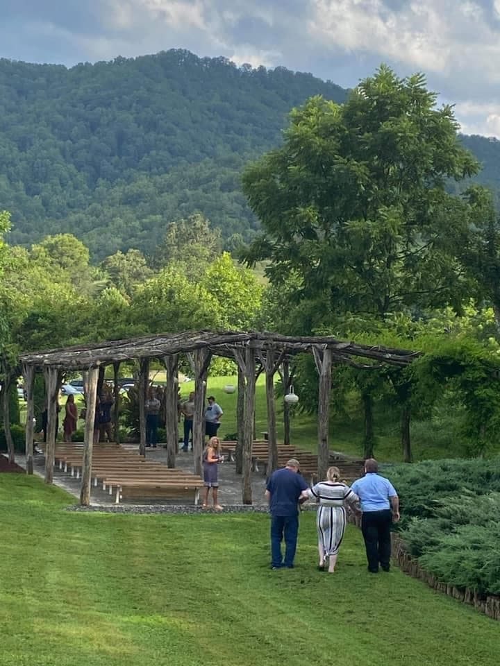 Our large event center (6,000 sq ft) was recently constructed with weddings in mind including a caterer's prep kitchen, a huge wrap around porch (1200 sq ft), changing areas for the bridal party, private groom's party deck, permanent outdoor pergola (1,872 sq ft) with benches and draping for your ceremony, an outdoor pavilion (1,800 sq ft) with picnic tables and event grills for your rehearsal dinner, fire pit and ample parking all featuring long range mountain views and beautiful seasonal garden.