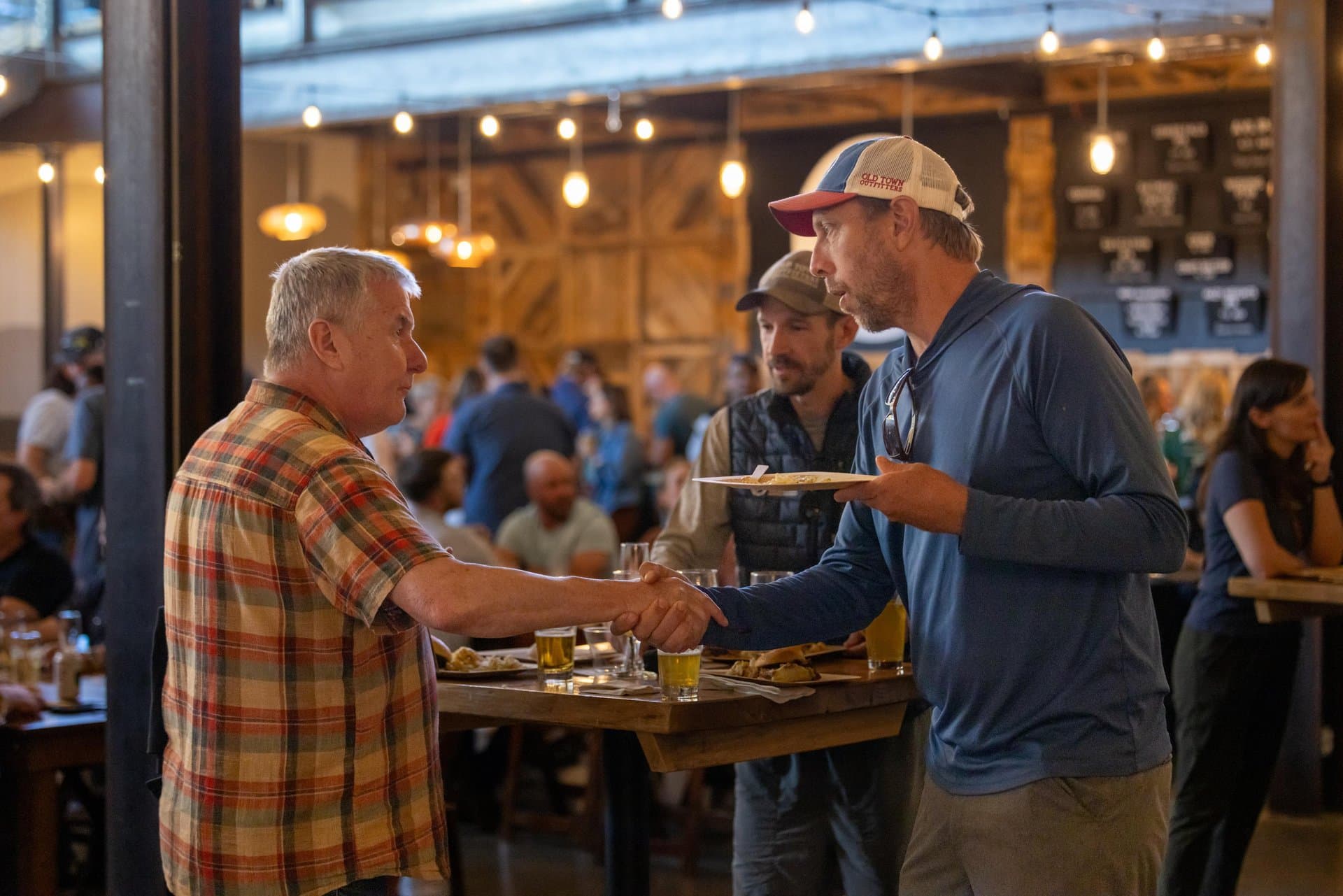 Russell Walters greets an attendee at AdventureELEVATE's opening reception hosted at Highland Brewing Company's Event Center in Asheville.