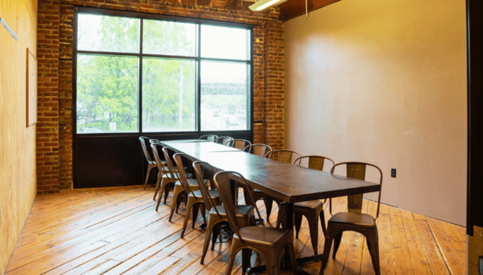 The workshop space includes conference tables, chairs and AV equipment. We have two spaces available on the 2nd floor and is accessible by elevator or stairs. 14 people seated for workshop classes.