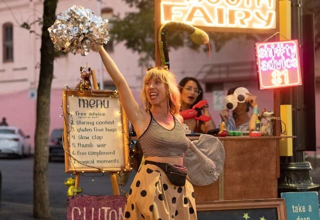 With a full menu with items including free compliments, thumb war, bad advice, standing ovation , gluten free hugs, etc she engages with people and evokes big belly laughs, authentic conversation, and child like joy!