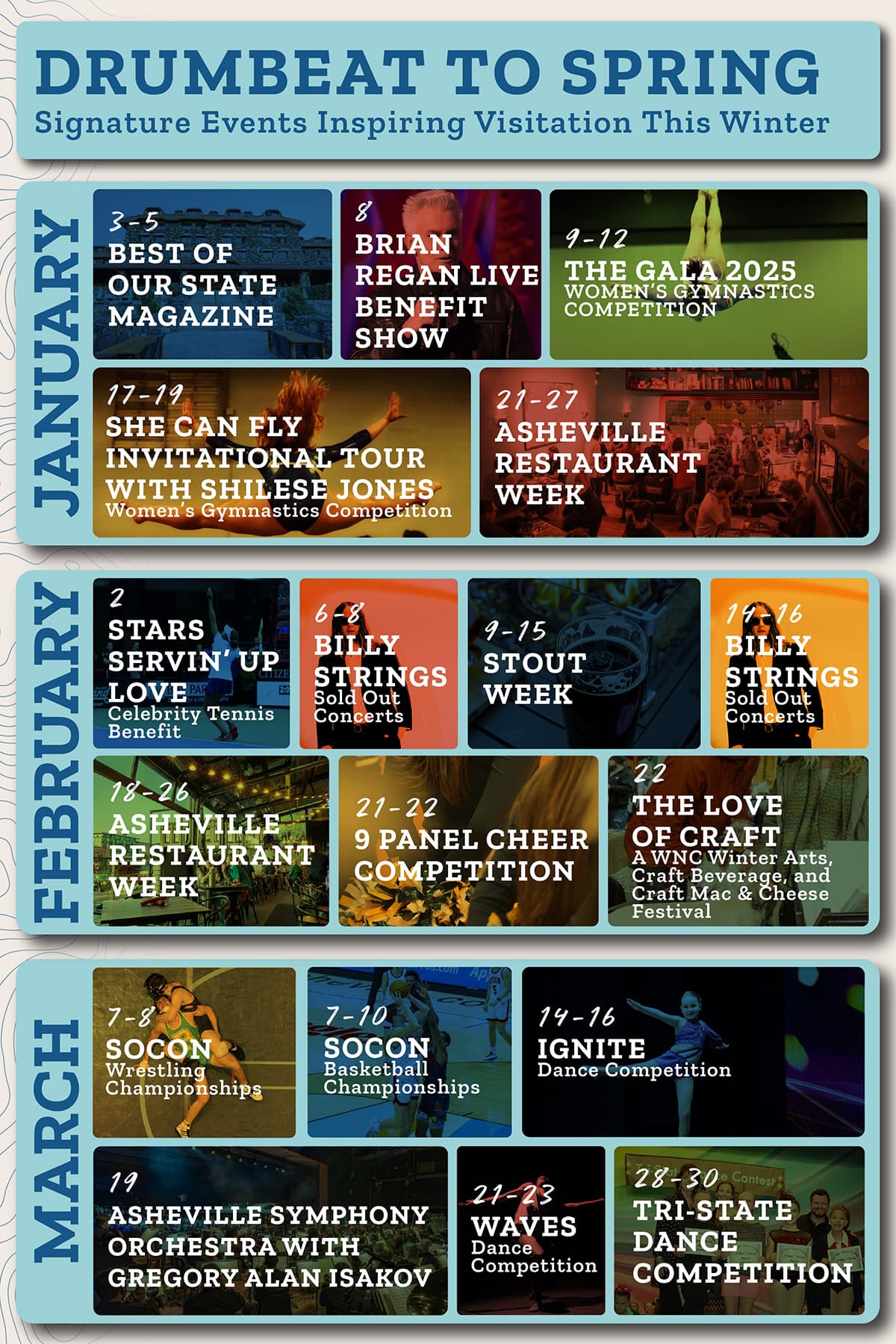 Explore Asheville is working with partners for our community’s revival this winter. We understand businesses have many decisions to weigh as we enter the first quarter of 2025 and have been working collaboratively to secure a calendar full of joyful events set to inspire residents, visitors, and large groups to be part of the comeback for Asheville with heart during the winter shoulder season. Please use this calendar to plan your winter staffing and promotions.