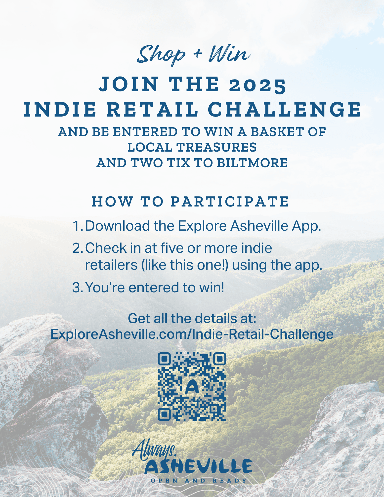 This July, the Asheville area is celebrating Independent Retailer Month with a citywide scavenger hunt — and we’re on the list! Use the Explore Asheville App to check in at indie retailers all month long and get entered to win two tix to Biltmore + an amazing basket of local goodies. Come find us and start exploring! Get all of the details at exploreasheville.com/indie-retail-challenge!