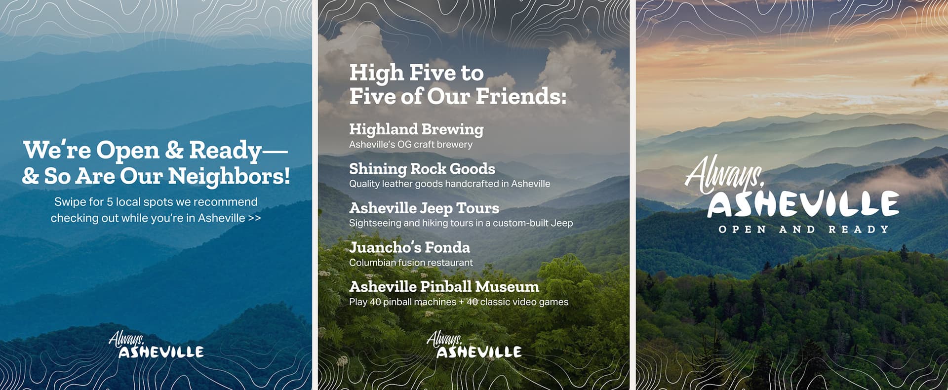 - Slide 1: "We’re Open & Ready — & So Are Our Neighbors! Swipe for 5 local spots we recommend checking out while you’re in the Asheville area >>”