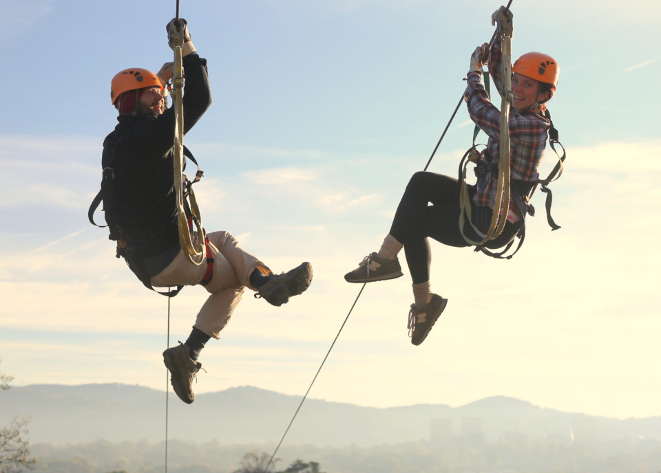 Asheville Zipline Canopy Tours For ages 8 and over, we offer our Asheville Zipline Tour which is an urban zipline tour with 9 ziplines and 1 sky bridge to go zipping through the trees with views of downtown Asheville. Or, if you want the thrill with a shorter trip time, our Skyline Tour with 5 ziplines is perfect. Both trips include zipping side by side with a friend down 1,200-foot lines.Â