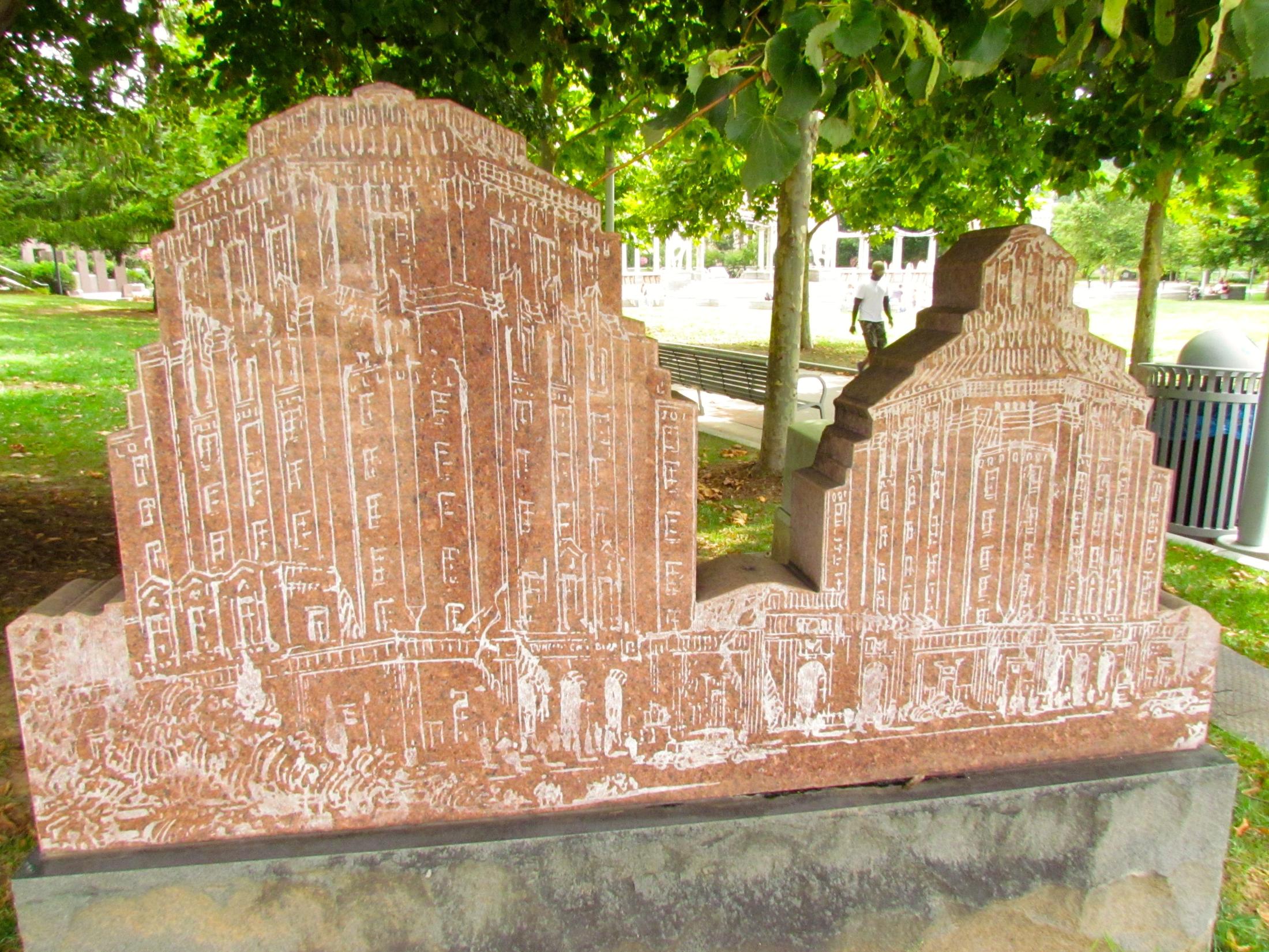 This granite etching renders Douglas Ellington’s original working concept of two art deco buildings of government, sitting side-by-side. Only one followed plan ~ the intricately layered City Building, controversial at the time, a fond blessing today. Feather ornamentation throughout the structure honors the history of the Cherokee Indians in these mountains.