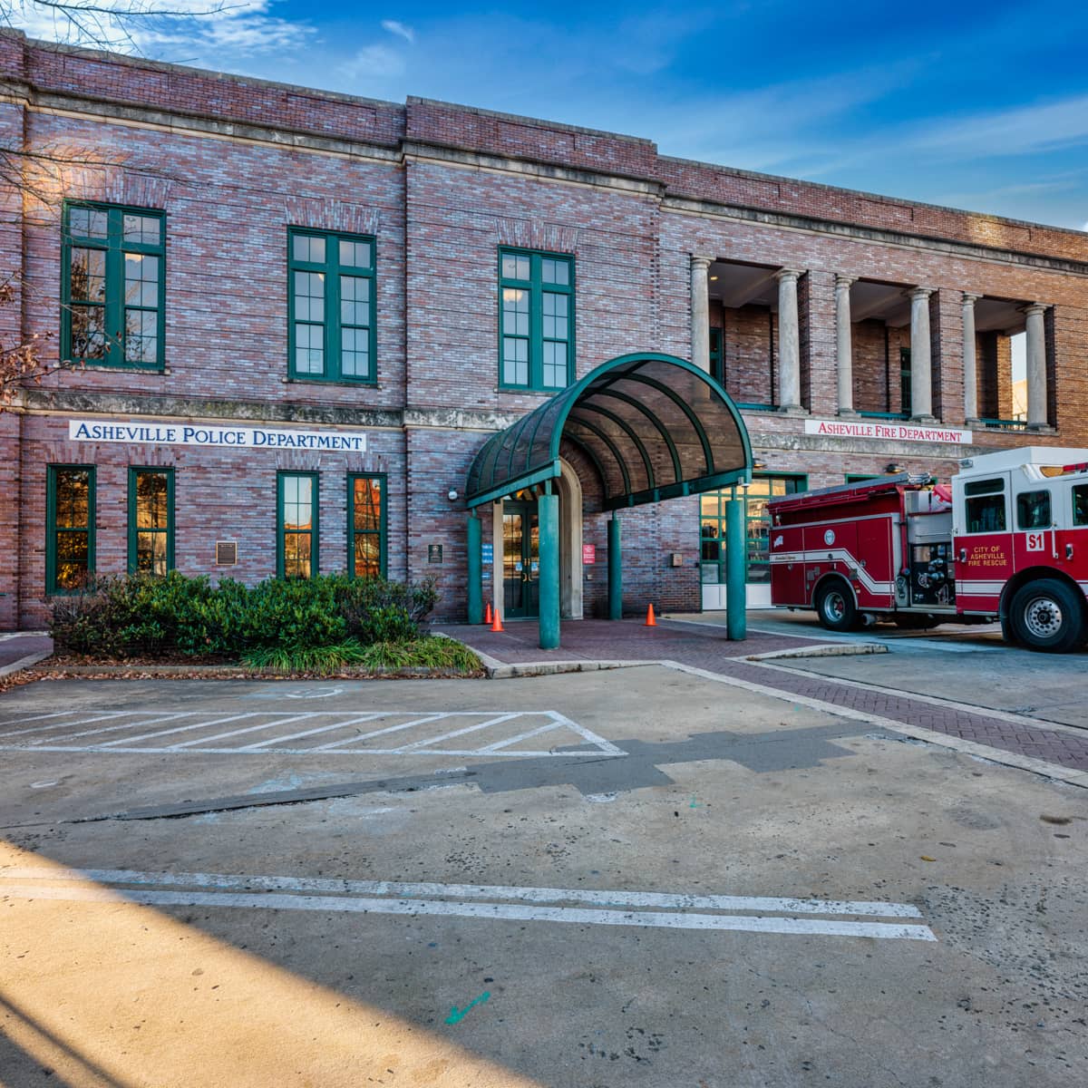 This two-story brick-faced building was designed by architect Ronald Green and originally housed the city’s police, fire, and health departments and city jail. The City (Farmers’) Market, one of the finest in the southeast, occupied its lower level. On the Market Street side, note the Roman arch entrance, and the cornucopias reflecting its use as a food market. Two plaques honor Mr. Miller: one embedded in the sidewalk on the Market Street side, and the other to the left of the main entrance to the Police Department.