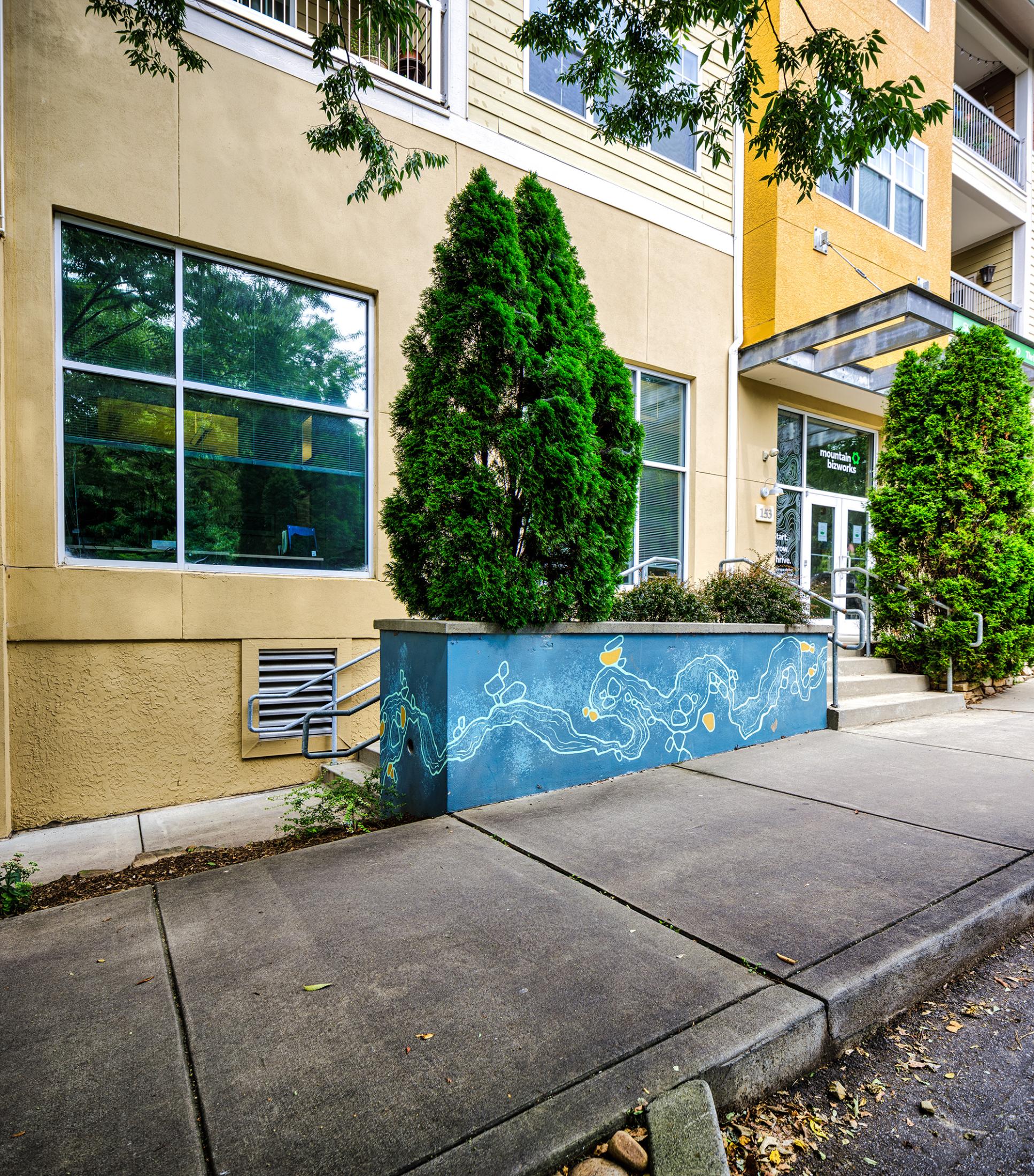 “French Broad Topo Impression” is a series of planter box murals at 149 - 161 South Lexington created by Brushcan Custom Murals in collaboration with Lexington Station residents and business owners. Inspired by the natural beauty of Asheville’s local surroundings, the planter boxes feature graphic representations of flowing rivers that have been abstracted into stylized forms. The water motif is also meant to echo the history of the creek that once flowed where the building now stands.