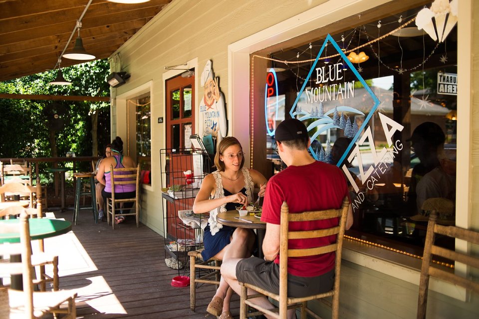 - Blue Mountain, a family friendly, neighborhood place to sit, relax, have some great food, a cold beer, listen to wonderful music, get up on stage for open mic night or just sit out on our front porch and enjoy the day. A place for the town of Weaverville and points north to call their own. Come with your family, friends or come alone and meet new neighbors.