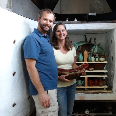 Rob and Beth Mangum, from Mangum Pottery Studio and Gallery seven miles from Asheville, in Weaverville, NC, come from a family of potters. Their creative process is guided by the clay itself, through years of studying the nature of the materials.